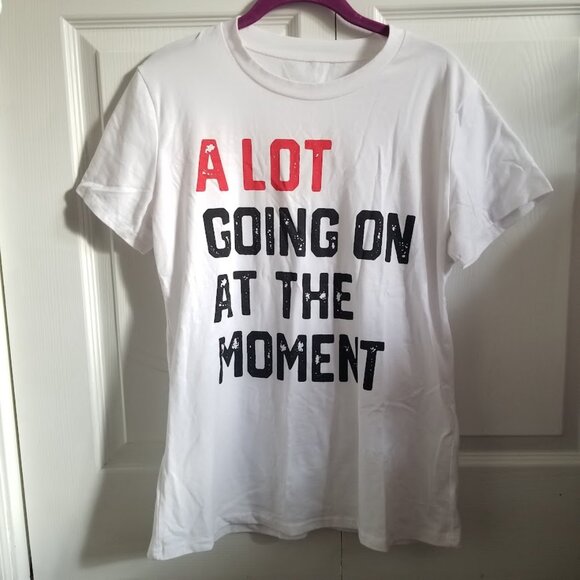 White Taylor Swift-inspired graphic t-shirt that says "A Lot Going on at the Moment" on it, size small. Soft and comfortable. Only worn once, like new, EUC. I also have some Taylor Swift shoes available on my page, so be sure to check them out if you're interested!