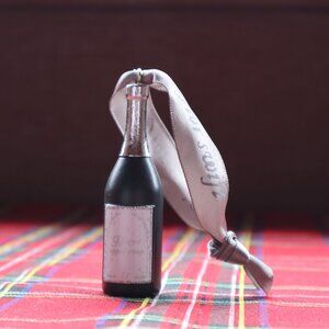 This Taylor Swift folklore album Ornament is a wine bottle with "August sipped away,"" ""ts," and a vine and star design on the label. The ribbon has "Taylor Swift" in the album font printed on it.