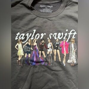 Official Taylor Swift merch from the GRAMMY-album-of-the-year Folklore album cycle. Dark gray crew neck sweatshirt featuring color illustrations of Taylor Swift through the eras: Debut, Fearless, Speak Now, RED, 1989, reputation, Lover, & folklore.