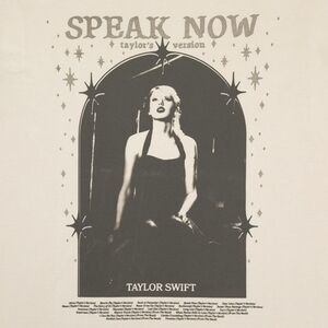TAYLOR SWIFT Taupe t-shirt with cuffed sleeves featuring photo of Taylor Swift with twinkle design and "Speak Now Taylor's Version", "Taylor Swift", and Speak Now (Taylor's Version) tracklist printed on front.