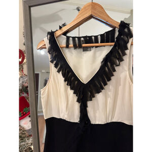 The dress in the image is a beautiful black and white dress with a contrasting ruffle neckline. It is a classic, elegant piece that would be perfect for a variety of occasions.