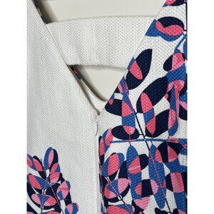 Fresh and feminine Taylor dress in crisp white with vibrant pink and blue floral print. Sleeveless shift silhouette with back keyhole detail. Perfect for weddings, garden parties, or polished workwear. New with tags.