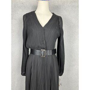 black pleated dress, Taylor dress, size 12 dress, black midi dress, polyester dress, lined dress, v-neck dress, belted dress, long sleeve dress, elegant dress, pleated midi dress, Taylor midi, black formal dress