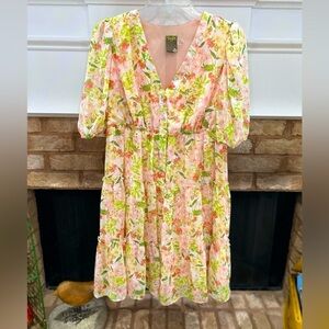 Taylor Women's Dress Floral Short Puff Sleeve Tiered Lined Half Button Size 6