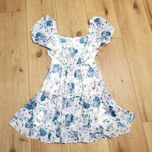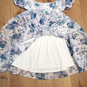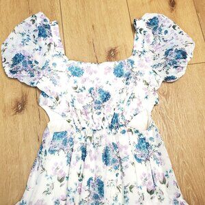 Beautiful, flowy "Taylor" Dress, Ties At The Waist Size 2. White with blue and purple flowers.