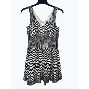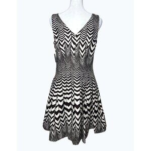 This dress is an elegant statement piece, featuring a bold black and white chevron pattern. Its sleeveless design allows for versatile wear, whether layered with a jacket or worn alone, and it flatters the figure with its gently flared skirt. Made with a blend of cotton and spandex, it offers a comfortable fit while maintaining its structured silhouette. This dress is ideal for those who appreciate a modern yet timeless style that can seamlessly transition from day to night.