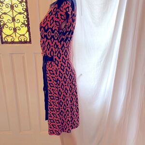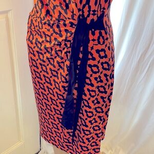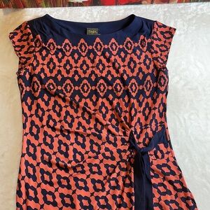 Taylor dress beautiful blue/ coral colors with side tie to emphasize waistline no flaws. Dimensions aprox. Chest 36” waistline 30” waistline to hem 22”