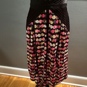 Taylor watercolor dot ridged cinched waist detail stretch knit midi. Narrow set in waistband. Narrow black channels on flared skirt. Pullover. Polyester/spandex blend. Size 6. Like new. Nonsmoking home.