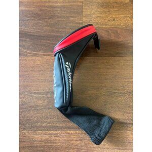 Genuine TaylorMade Rescue Mid Hybrid Headcover, black and red with embroidered TaylorMade logo. Sleek, durable design with soft knit sock and adjustable number tag (3-5-7-X). OEM replacement headcover that fits most hybrid/rescue clubs.
