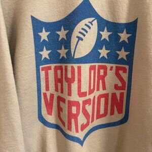 Show off your Swiftie pride with this cozy beige sweatshirt featuring a bold “Taylor’s Version” football-inspired shield graphic in red and blue. Perfect for game day, concerts, or lounging in comfort.