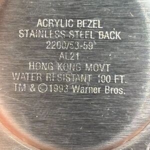 Vintage 1993 Armitron Looney Tunes Taz Sport quartz wristwatch featuring the Tasmanian Devil kicking a soccer ball. Acrylic bezel with stainless steel back and original black rubber strap. Case back reads ©1993 Warner Bros., and the included collectible watch box shows ©1994 Warner Bros. A brand new battery has just been installed, and the watch is in good working condition. Light surface wear and minor scuffing on the crystal consistent with age. See photos for measurements and condition details.