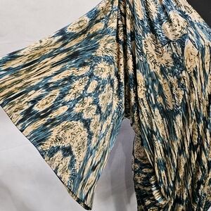 Tan, blue lightweight Dress with Plunging Back and tie across upper back. Lose fit bodice with fitted undertop, and bat wing sleeves and a more fitted Asymmetrical bottom. 94% Venezia 6% Spandex. Size S