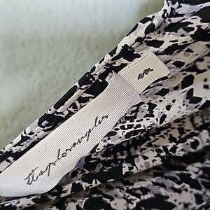 Has an animal like print. White with black and gray. Soft and stretchy fabric. 1 long sleeve with elastic at the wrist. There is also elastic at the bottom so the top will have a banded like bottom. Knot in the front. Great condition. Dressy club like apparel. 90's, Y2K, flirty, girly, dinner, date night, neutral