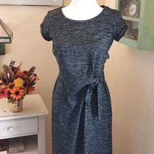 So pretty and comfortable, this fabric just slides over your curves. A tie at the waist defines there. Short sleeves. Pockets. Size S measures 36 at chest, 34 at waist, adjust here, 42 at hips, pockets here, 51 long from shoulder to hem. Great all year, and like NEW.