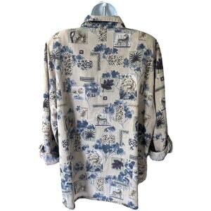 Vintage safari wildlife print button down shirt in beige and blue with a relaxed silhouette. Super soft lightweight fabric. 1990s vintage style. Features allover animal print patchwork and foliage. Condition: Excellent vintage condition, no flaws.