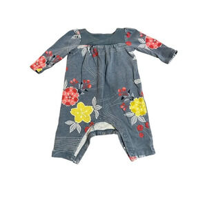 Tea Baby Onesie SZ 0-3 M Floral Long Sleeve Gray Blue Snap Button V-Neck