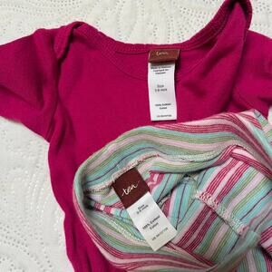 Tea Collection two piece baby outfit. Included long sleeve one piece bodysuit in solid pink with Little City Stripe baby pants in bouquet. Very good condition, light wear. Size 3-6 months.