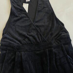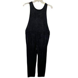 Black velvet sleeveless pants jumpsuit with criss-cross front and pockets on the pants. Wear with a tank underneath or a long sleeve blouse or turtleneck.