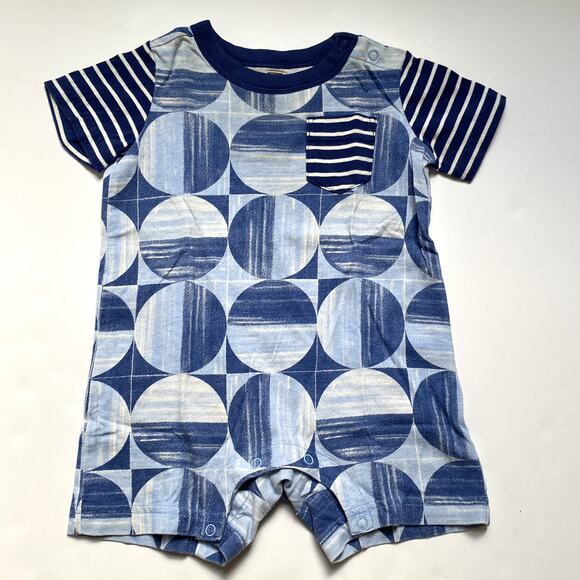 Beautiful Tea Collection blue patterned romper, size 6-12m. Washed cold & hung dry.