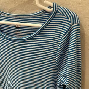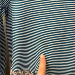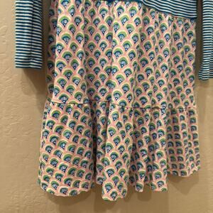 Tea Collection long sleeve dress size 8. Blue and white stripe bodice with pink and blue fans on skirt. Supper cute tiered style with twirl! Good condition for faint spot on bodice.