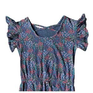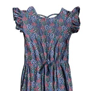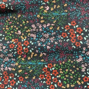 Dark background with ditsy floral print and ruffle sleeves