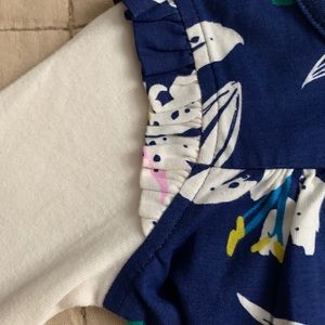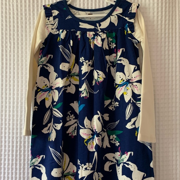 Adorable NWOT Tea Collection playdress. Blue background with white flower pattern and contrasting white long sleeves. Little flutter at shoulders. 100% Cotton. Size 5. Perfect dress for Fall/Back to School!