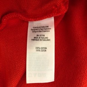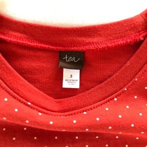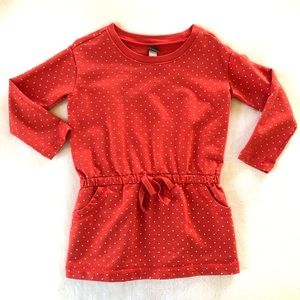 Tea long sleeve dress with drawstring waist and front pockets. The color is mostly red with a hint of orange, white pin dots. 100% cotton in a heavier sweatshirt-like material. Like new condition, no significant flaws.