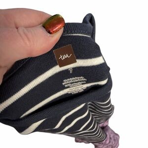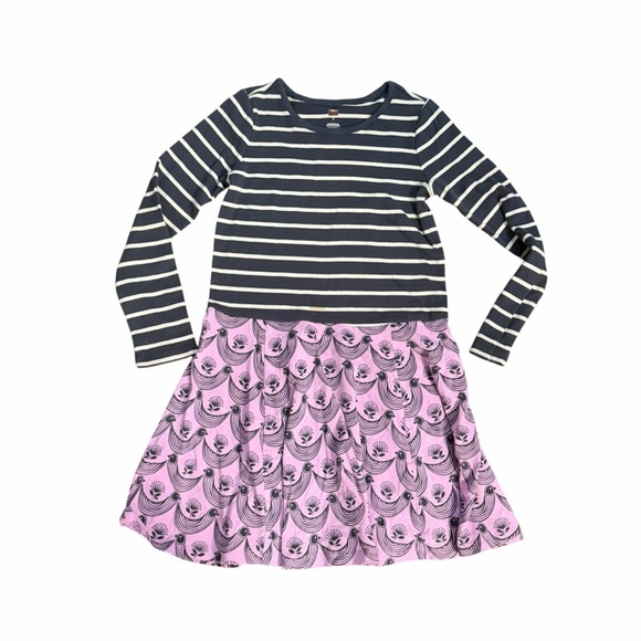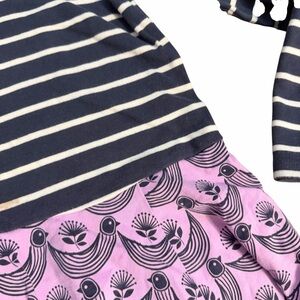 Stylish dress with navy stripes and a pink patterned skirt. Ideal for casual outings.