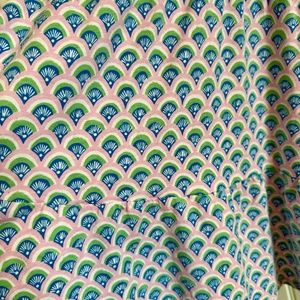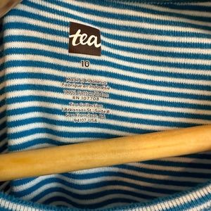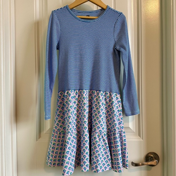 Dual pattern dress with blue and white strips above and stylized fans below in pink, green, and blue, 100% cotton, Jersey material, size 10, worn a few times.