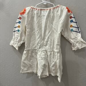 Tea Collection long sleeve dress size 2. White with bright colorful embroidered floral on sleeves and tassel on neckline. Very good condition.