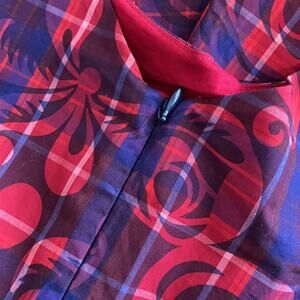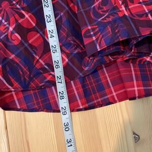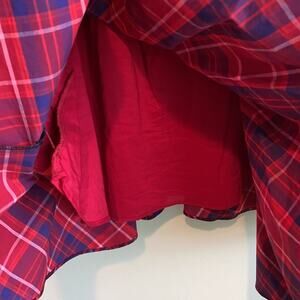 Slight high low hemline, pockets, hidden zipper up back. Floral and plaid design