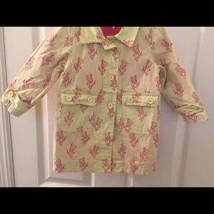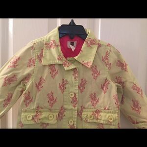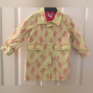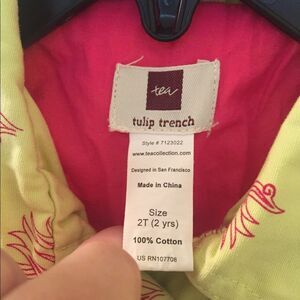 Tea Collection Girls Yellow and Pink Tulip Trench Coat Size 2T. Such a pretty and unique jacket. The colors are a perfect contrast. Has been worn and washed, but no issues that I can find. Excellent Used Condition.