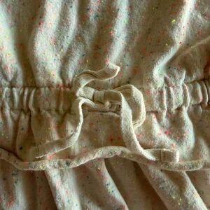 Long sleeve, crewneck with v-stitch, elastic waistband with tacked drawstring bow detail and ruffle trim, ivory with neon textured confetti.