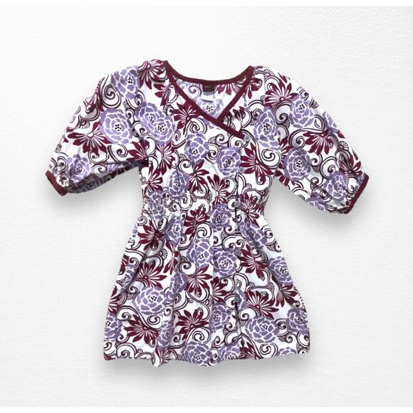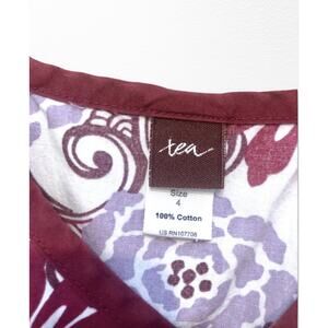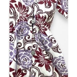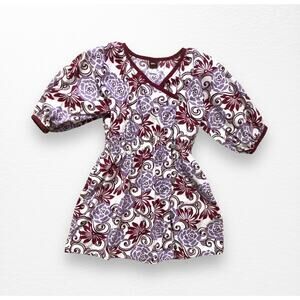 Beautiful Tea Collection “Las Posadas” puff sleeved dress in size 4. Lightweight 100% cotton, full button wrap v-neck front, puff sleeves, and a smocked waist. Floral print with lavender, off-white, and crimson. Excellent pre-owned condition.