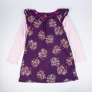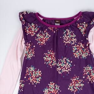 This is a long sleeve, layered tunic dress by Tea Collection in purple with an all over print of colorful, flower petal inspired graphics. Features ruffles at shoulders and pink sleeves.