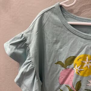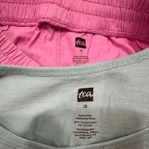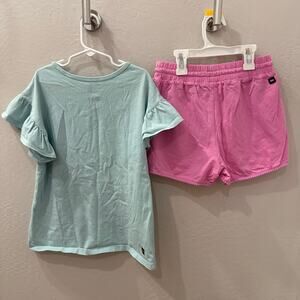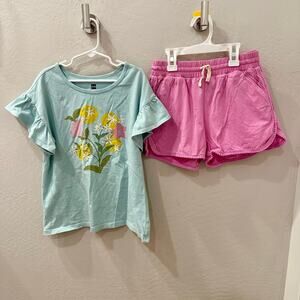 Tea Collection short sleeve shirt & shorts outfit size 12. Light blue shirt with ruffle sleeves featuring lemons & floral print on front. Paired with solid bright pink Pom shorts. Super cute! Very good condition.