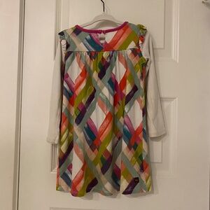Tea Collection brand multicolored ribbon stripe long sleeved shirt. Girls size 4T. Ruffle detail at the shoulders. Sleeves are white with multicolored stripes. Small mark on the front of the dress. From a pet and smoke free home that uses unscented detergent.