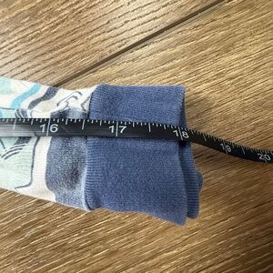 Top: Long sleeve with navy cuffs, round neck, nautical print