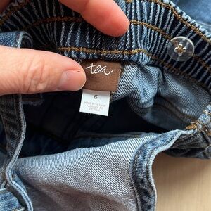 Tea Collection jean overalls, size 6 years. These have a knot that goes to the top part of the bibs, and also have an adjustable button strap that goes to the back of the overalls. Super cute! Barely worn.
