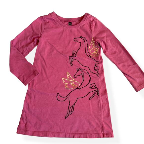 Size 3, Tea Collection, long sleeve dress. Pink cotton dress with adorable pegasus horse with metallic wings on front. No stains or flaws, light wear, very good used condition.