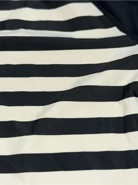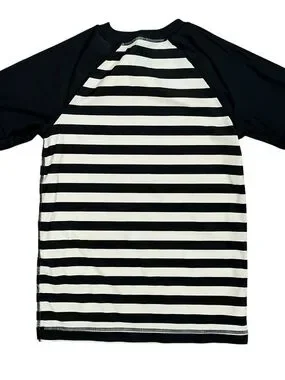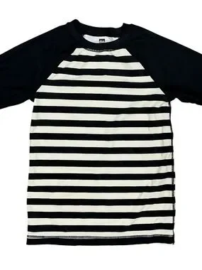 Classic black and white striped tee. Raglan sleeves in solid black. Soft, casual style. Easy to pair with any outfit.