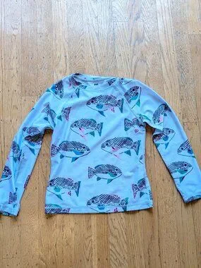 Tea Collection longsleeve rashguard, size 7. The close-up pictures with the grayer background are closest to the true colors. The background is slight grayish-blue, not as blue as in the cover photo and photo of the back of the shirt.