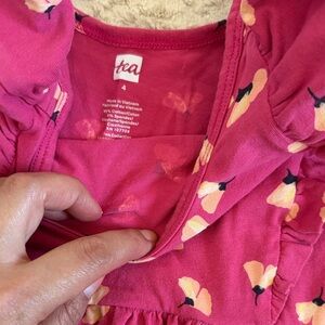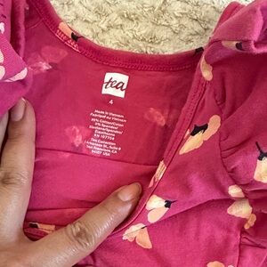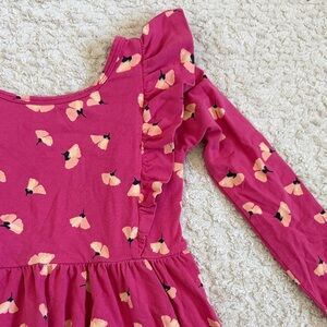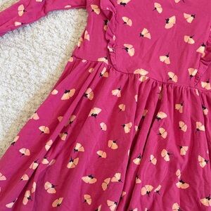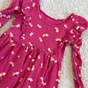 Charming pink dress with floral pattern. Features playful ruffles. Perfect for casual wear.