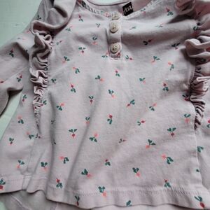 This long sleeve top features ruffles on both shoulders and has a hot pink and red radish print. Fabric is 95% Cotton and 5% Spandex. No rips, stains, tears, or major wear.