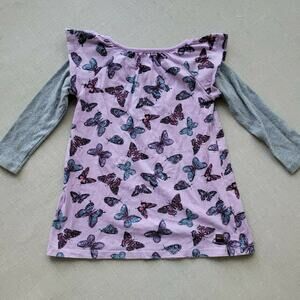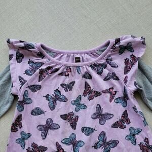 Tea Collection Scotland Butterfly Dress, size 2. Lavender with butterfly print. Long sleeves are gray. A couple blemishes as shown in pictures.