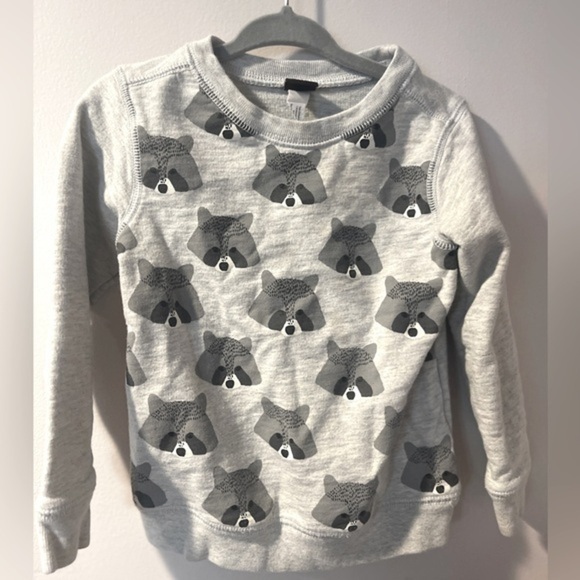 Adorable raccoon print Tea Collection sweatshirt. Gray with raccoons. Size 18-24 months. Soft and cozy. Good condition with the faintest trace of a small stain on front (shown - can barely see it).
