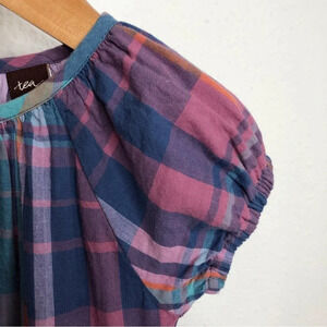 Stitch Society x Tea Collection dress by artist Mahamaya Sikdar, short sleeve, French blue and purple plaid with orange embroidery, fully lined, puff sleeves, 100% cotton, India collection, toddler girl dress.