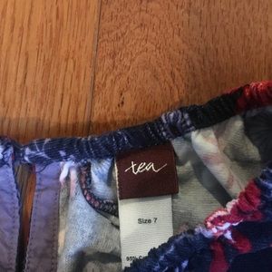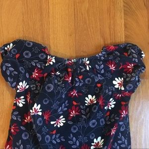 Navy blue corduroy dress with red white and light purple flower details; loop button in back. Beautiful dress for the winter! 95% cotton 5% spandex, machine was tumble dry.