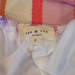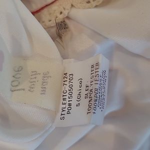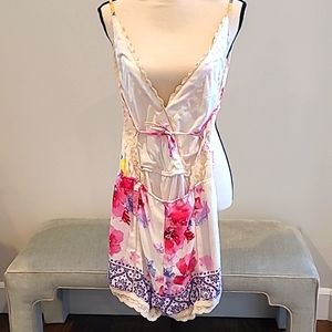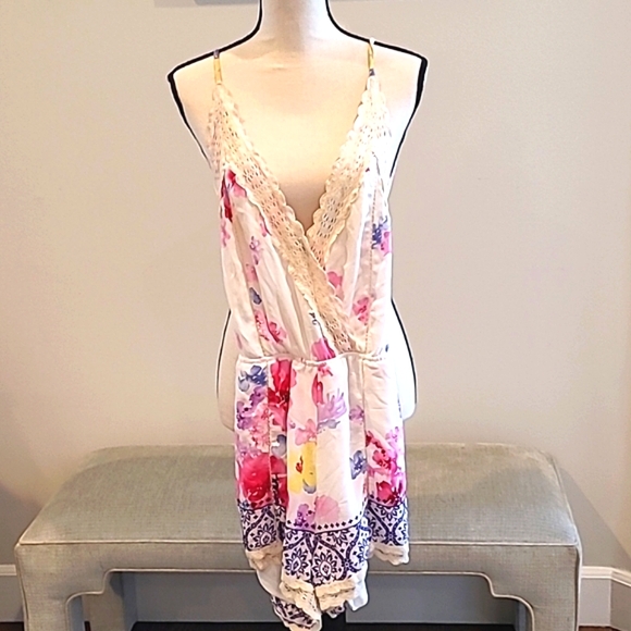 Short Romper. Fully lined. Backless. Adjustable straps. Hidden Side Pockets. Crochet lace trim around legs and top. Size Small.