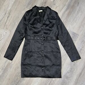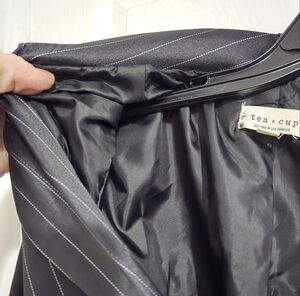 Fancy and silky Tea & Cup blazer/coat. It's a dark black color with white vertical stripes. Has a full button-up and a wrap around belt. Also has light built-in shoulder pads. Still in good used condition. The only imperfection is a slight snag on the back side, shown in pictures. Perfect for date night, fancy outfit, workwear, business casual, cocktail party, vacation, date night, mob wife, quiet luxury, etc.